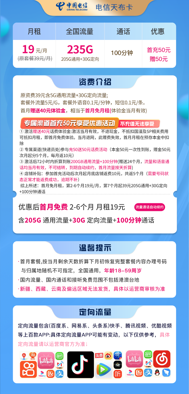 电信天布卡 19元205G通用+30G定向+100分钟通话 流